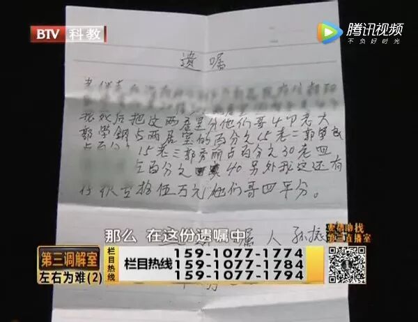 而此时,情况突变。在父母生前房屋里住了两年半的三姐声称,她在整理遗物时,在母亲的钱包中找到了一份遗嘱,遗嘱言明:将房产分给四各子女,老大、老二各占15%,老三占30%,老四占40%;另有存款15万元由四人平分。这份遗嘱的出现,使得郭家的局面变得扑朔迷离了起来。